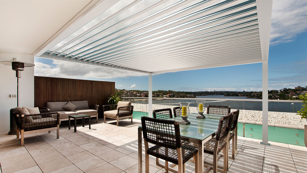 Mit dem Pergolasystem clima Q.bus erhalten Sie eine flexible Überdachung für effektiven Hitze- und Blendschutz. Durch die wendbaren Aluminiumlamellen können Sie die Sonne durchlassen und erhalten im geschlossenen Zustand bei Regen einen erstaunlich guten Schutz. Durch das Regenrinnensystem kann das Wasser unsichtbar in den vorderen Stützen ablaufen.