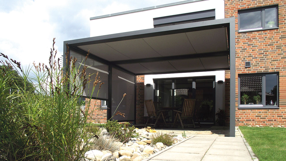 Die kubische Grundform des Q.bus®-Systems ermöglicht neben ihrer modernen ArchitekturErscheinung die Erweiterung zu einer Art textilen Wintergartens. Aufgrund der rechtwinkligen Seiten- und Frontbereiche können hier zusätzliche Senkrechtanlagen montiert werden, die als seitensaumgeführte Markisen (SZ-Anlagen) eine perfekte Ergänzung der Horizontalbeschattung darstellen. Damit entsteht die Möglichkeit einer nahezu rundherum geschlossenen, textilen „Behausung“, die eine deutlich erweiterte tages- und jahreszeitliche Nutzungsdauer sichert.