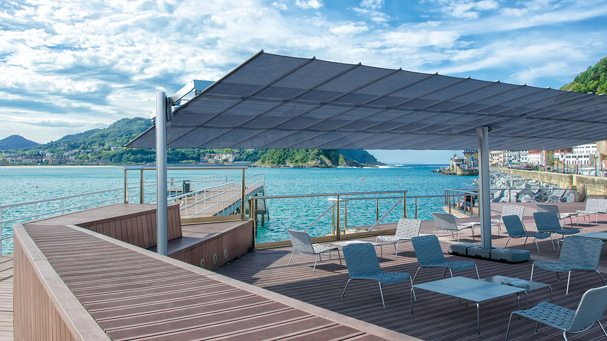 Das modulare System mit modernem und linearem Design, das die Beschattung großer Flächen ohne Belegung des Zentralbereichs ermöglicht. In 10 Größen verfügbar, die ggf. miteinander kombiniert werden können. Das System gestattet die Kombination mehrerer Module und ermöglicht die Beschattung großer Flächen. Der Sonnenfächer lässt sich dank seines sowohl manuellen als auch elektrischen Systems leicht schließen und kann geneigt werden, um im Tagesverlauf stets das Maximum an Schatten zu spenden.