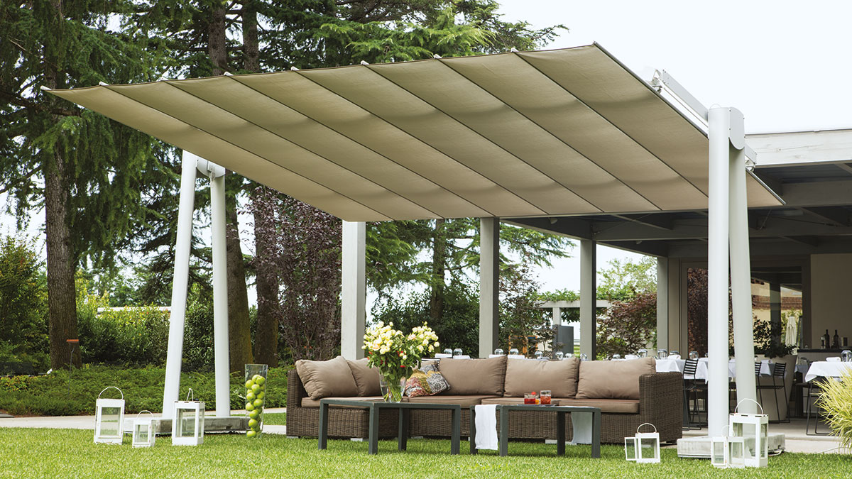 Ein innovatives System zum Öffnen und Schließen, ohne dass darunter befindliche Tische und Stühle umgestellt werden müssen. Diese Ausführungsinnovation macht das Reflex Teleskop zum idealen Produkt für den Sonnenschutz großer Terrassen.