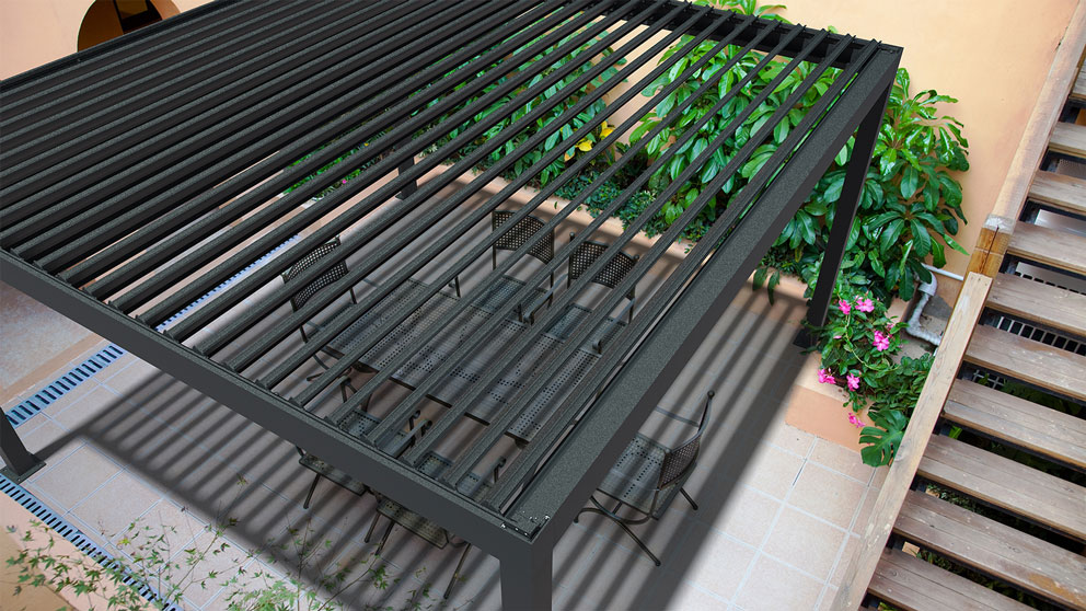 Mit dem Pergolasystem clima Q.bus erhalten Sie eine flexible Überdachung für effektiven Hitze- und Blendschutz. Durch die wendbaren Aluminiumlamellen können Sie die Sonne durchlassen und erhalten im geschlossenen Zustand bei Regen einen erstaunlich guten Schutz. Durch das Regenrinnensystem kann das Wasser unsichtbar in den vorderen Stützen ablaufen.