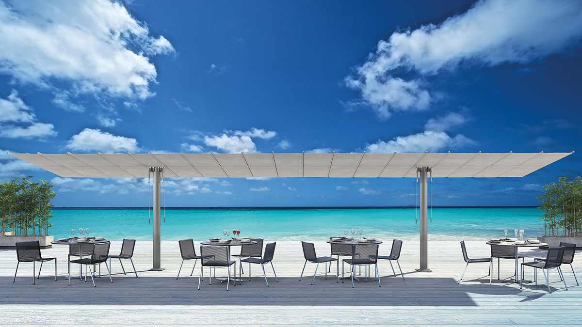 Das modulare System mit modernem und linearem Design, das die Beschattung großer Flächen ohne Belegung des Zentralbereichs ermöglicht. In 10 Größen verfügbar, die ggf. miteinander kombiniert werden können. Das System gestattet die Kombination mehrerer Module und ermöglicht die Beschattung großer Flächen. Der Sonnenfächer lässt sich dank seines sowohl manuellen als auch elektrischen Systems leicht schließen und kann geneigt werden, um im Tagesverlauf stets das Maximum an Schatten zu spenden.